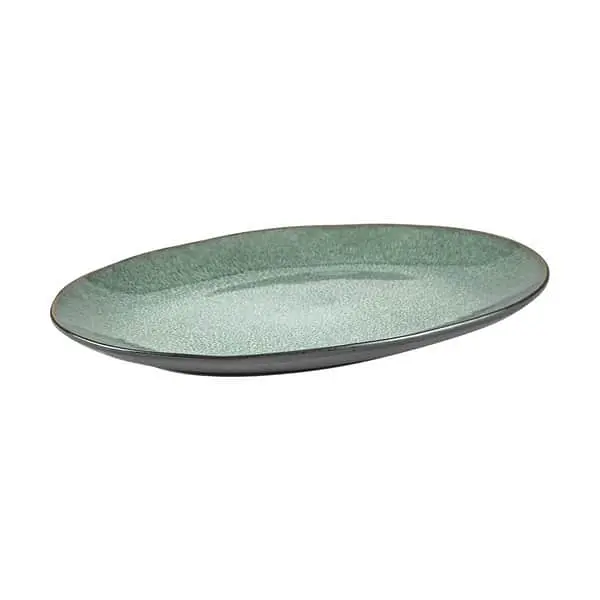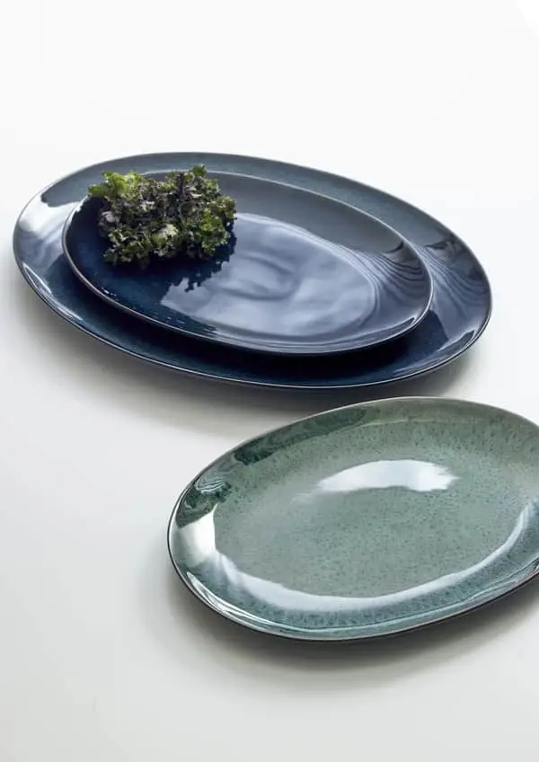 Dæk bord med Bitz og server fisk eller grillede bøffer på den ovale tallerken i robust stentøj. Tallerkenen har en mat yderside og en farvet blank inderside, der glæder alle dine sanser og klæder den mad du serverer.