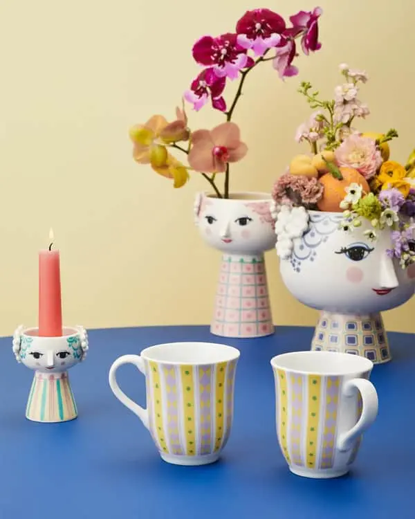 Hans streg er genfortolket som udsmykning på en serie af kopper, fade, blomsterkrukker og meget mere. Hos Imerco kan du også finde smuk juleudsmykning i Wiinblads romantiske signaturunivers.