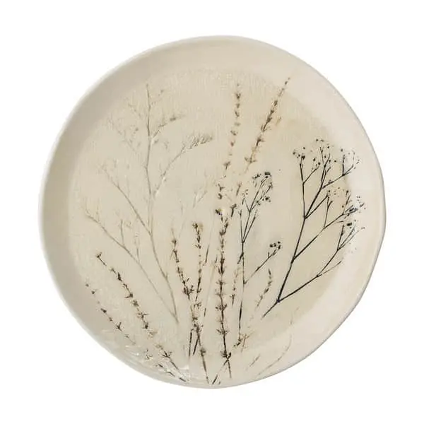 Den smukke Bea tallerken er håndlavet i stentøj og har en naturlig farve prydet med et fint blomstermotiv trykt på dens knitrende glasur.