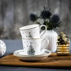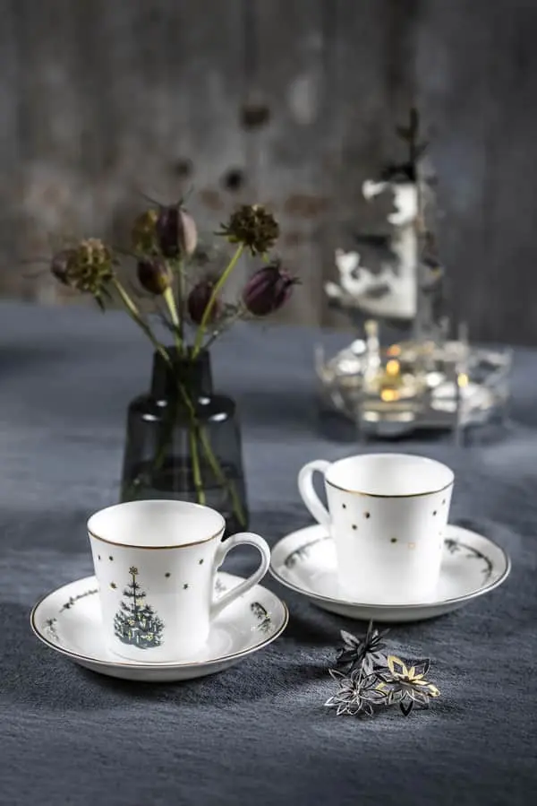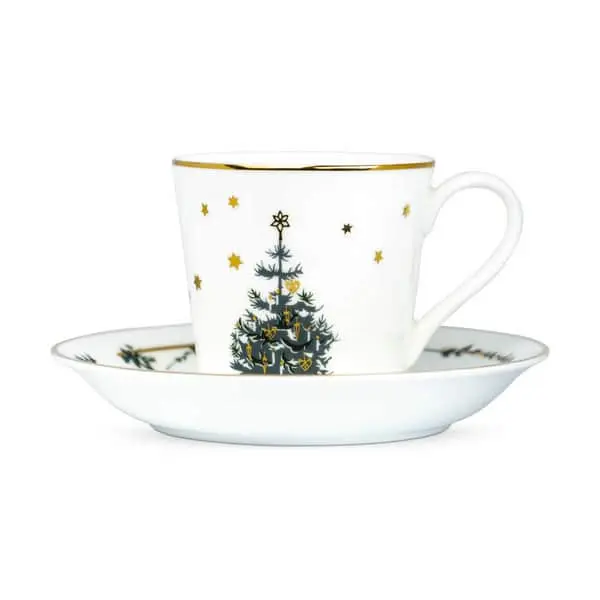 Den særlige julekop med underkop fra Jette Frölich er en sand stemningsspreder. Nyd en varm kop kaffe i koppen, hvis ydre prydes af det fineste juletræ og glimtende vinterstjerner.