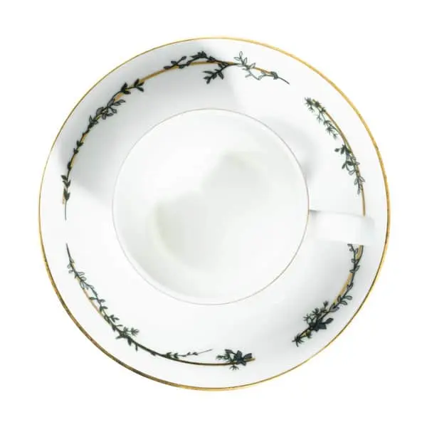 Stellet Vinterstjerner fra Jette Frölich Design er sirligt dekoreret med grene af paradisæbletræer og glimtende, gyldne vinterstjerner. Hvert element i stelserien har sin egen fortolkning af motivet. Og hver del af stellet har en skinnende guldkant.