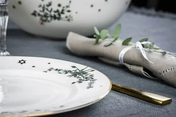 Stellet Vinterstjerner fra Jette Frölich Design er sirligt dekoreret med grene af paradisæbletræer og glimtende, gyldne vinterstjerner. Hvert element i stelserien har sin egen fortolkning af motivet. Og hver del af stellet har en skinnende guldkant.