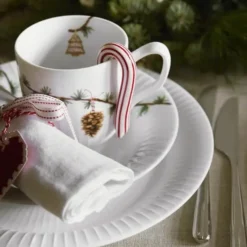 2020 kruset fra Kähler Hammershøi jul har i år smukke dekorationer af grankogler og flettede julestjerner, der hænger langs den grønne lærkegren. Byd dine gæster på lidt varmt gløgg i de fine krus fra Kähler Hammershøi.