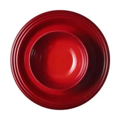 Middagstallerkenen har det ikoniske Le Creuset-design med de tre signaturringe langs den brede kant med rene og elegante linjer. Stentøjstallerknerne tåler mikrobølgeovn, ovn og fryser.