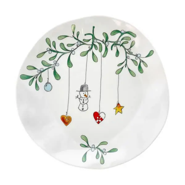 Server lune æbleskiver til dig og dine gæster på denne flotte tallerken fra Medusa Copenhagen. Tallerkenen er dekoreret med tegninger af juleophæng på den grønne gren.