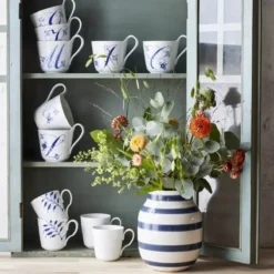 Alfabetkrusene er inspireret af Royal Copenhagens Musselmalet Riflet stel, som er det først stel og er helt tilbage fra 1775. Du kan genkende den klassiske form på højhankskoppen fra 1884.