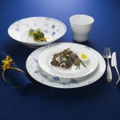 Blå Elements er opstået af Hvid og Multifarvet Elements og blomstrer med inspirerende nye dekorationer i den noble, kongelige blå farve. Resultatet er skønhed – enten alene eller kombineret med Hvid Elements, ligesom stellet kan få et endnu mere legende og moderne udtryk, hvis det kombineres med den traditionelle Musselmalede kollektion.
