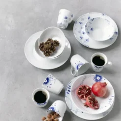 Blå Elements er opstået af Hvid og Multifarvet Elements og blomstrer med inspirerende nye dekorationer i den noble, kongelige blå farve. Resultatet er skønhed – enten alene eller kombineret med Hvid Elements, ligesom stellet kan få et endnu mere legende og moderne udtryk, hvis det kombineres med den traditionelle Musselmalede kollektion.