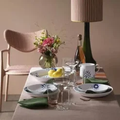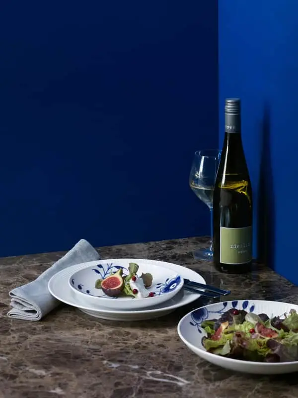 I 2000 skabte Karen Kjældgård-Larsen Blå Mega Mussel serien med inspiration fra det velkendte musselmalet – småt og blåt. Blå Mega Riflet er beviset på, at selv de bedste traditioner kan holde til at blive udfordret – stort og blåt. De store penselstrøg på det hvide porcelæn skaber et sofistikeret og kontrastfyldt udtryk, der klæder det moderne, nordiske hjem.