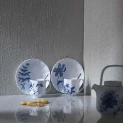 Stellet, Blomst, fra Royal Copenhagen er skabt i et møde mellem den traditionsrige kulturhistorie og et moderne designudtryk. Det klassiske blå blomstermotiv har fået lov til at gro frit på hvert element i serien. Hver tallerken, kop og underkop har sin egen enkelte påmalede blomst, som sammen skaber en dynamisk og livlig helhed, men samtidig giver hvert element sit eget individuelle look.