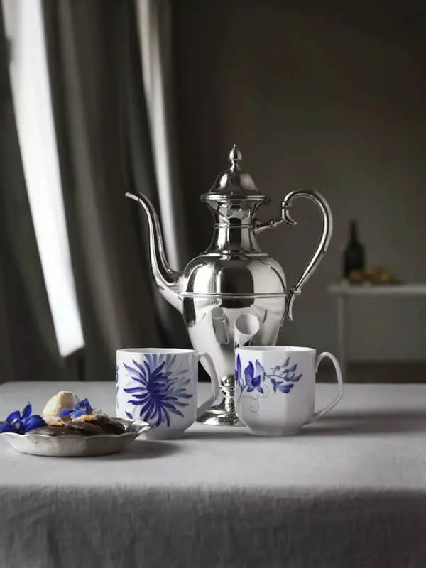 Stellet, Blomst, fra Royal Copenhagen er skabt i et møde mellem den traditionsrige kulturhistorie og et moderne designudtryk. Det klassiske blå blomstermotiv har fået lov til at gro frit på hvert element i serien. Hver tallerken, kop og underkop har sin egen enkelte påmalede blomst, som sammen skaber en dynamisk og livlig helhed, men samtidig giver hvert element sit eget individuelle look.