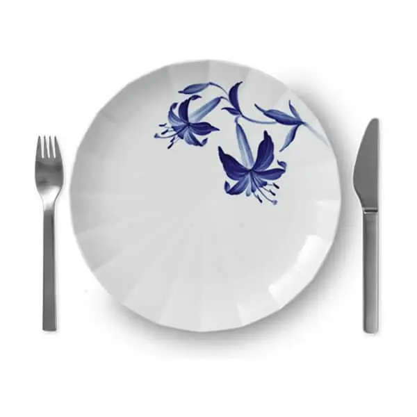 Kontrasten mellem det sarte, blå blomstermotiv og porcelænets hvide overflade giver tallerkenen fra Royal Copenhagen et moderne og grafisk udtryk. Tallerkenens bløde coupé-form tillader den smukke lilje at vokse frit på overfalden, som giver borddækningen en helt særlig stemning.