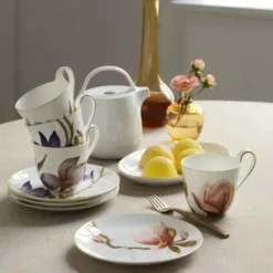 Hver steldel bærer på sit eget udsnit af blomster, som vi kender dem fra vores egne haver. Flora stellet er dekoreret med et unikt blomstermotiv, som hver især har sin helt egen betydning. Flora er en moderne fortolkning af det ikoniske Flora Danica stel, og giver på bedste vis de smukke blomstermotiver en enkel og eksklusiv elegance. Motivet er trykt med op til 20 farvelag og kanten er håndmalet med 23 karat guld.