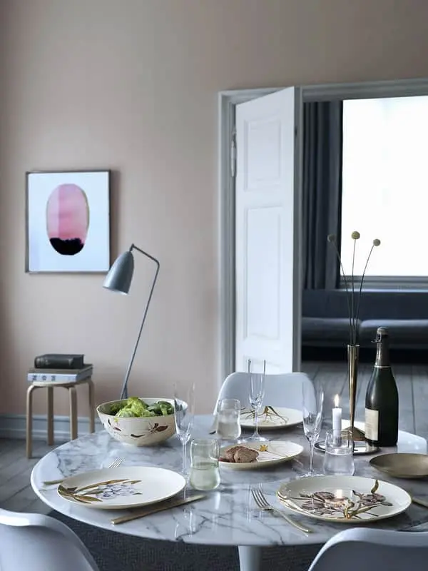 Hver steldel bærer på sit eget udsnit af blomster, som vi kender dem fra vores egne haver. Flora stellet er dekoreret med et unikt blomstermotiv, som hver især har sin helt egen betydning. Flora er en moderne fortolkning af det ikoniske Flora Danica stel, og giver på bedste vis de smukke blomstermotiver en enkel og eksklusiv elegance. Motivet er trykt med op til 20 farvelag og kanten er håndmalet med 23 karat guld.