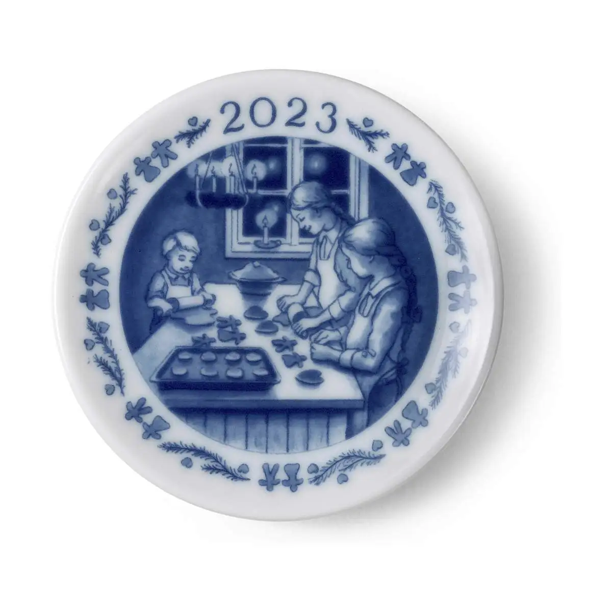 2023 juleplaketten fra Royal Copenhagen har et fint motiv af årets julebag, der bages af hele familien. Der bages kagemænd, kagekoner og julehjerter i skæret fra adventskransen.