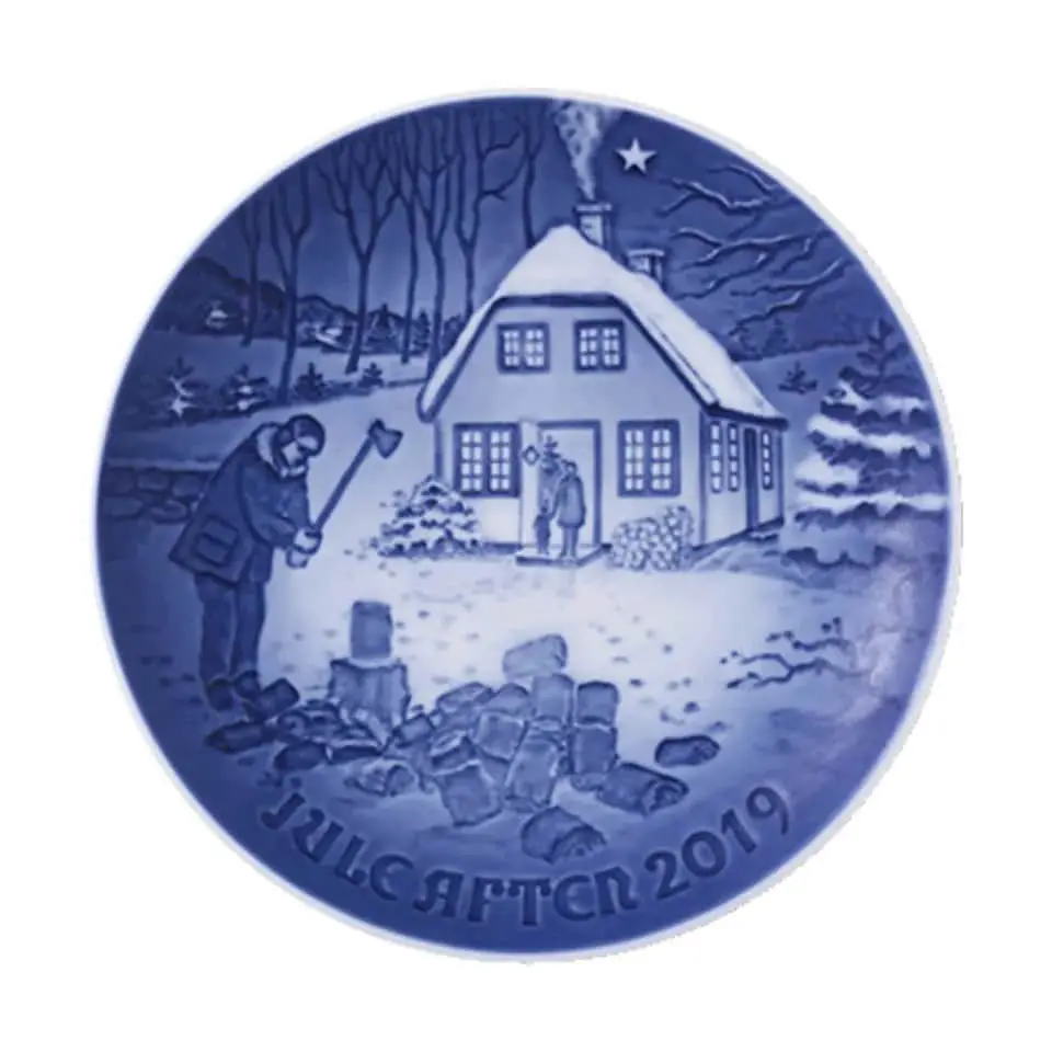 Det er koldt derude, og sneen ligger tungt over landskabet på denne julenat. Brændet skal hugges, så der kan blive tændt op i pejsen, og varmen kan sprede sig i huset. I døråbningen står familien og venter spændt på julehygge og -varme. Juleplatten fra Royal Copenhagen er blevet udgivet hvert år siden 1908. Motivet er som altid gengivet i den smukke, blå underglasur farve.
