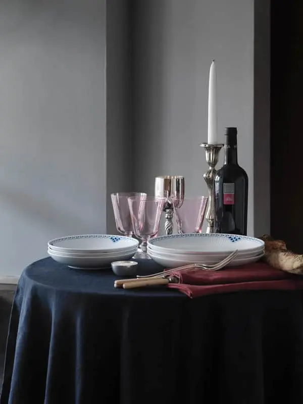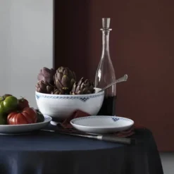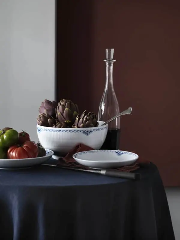 Royal Copenhagen har skabt en moderne tallerken, der kan få et simpelt måltid til at se raffineret ud. Tallerkenens let forhøjede kant danner sammen med den karakteristiske kniplingebort en sofistikeret ramme om maden.