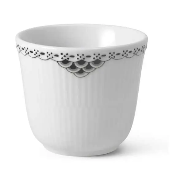 Der er intet så beroligende som at vikle hænderne omkring en varm drik, mens du nyder en stille stund for dig selv. Sort Riflet Blonde termokruset fra Royal Copenhagen er det perfekte valg til din morgenkaffe eller eftermiddagste. Den elegante sorte blondekant bryder forsigtigt den riflede overflade – en sand diskret klassiker.